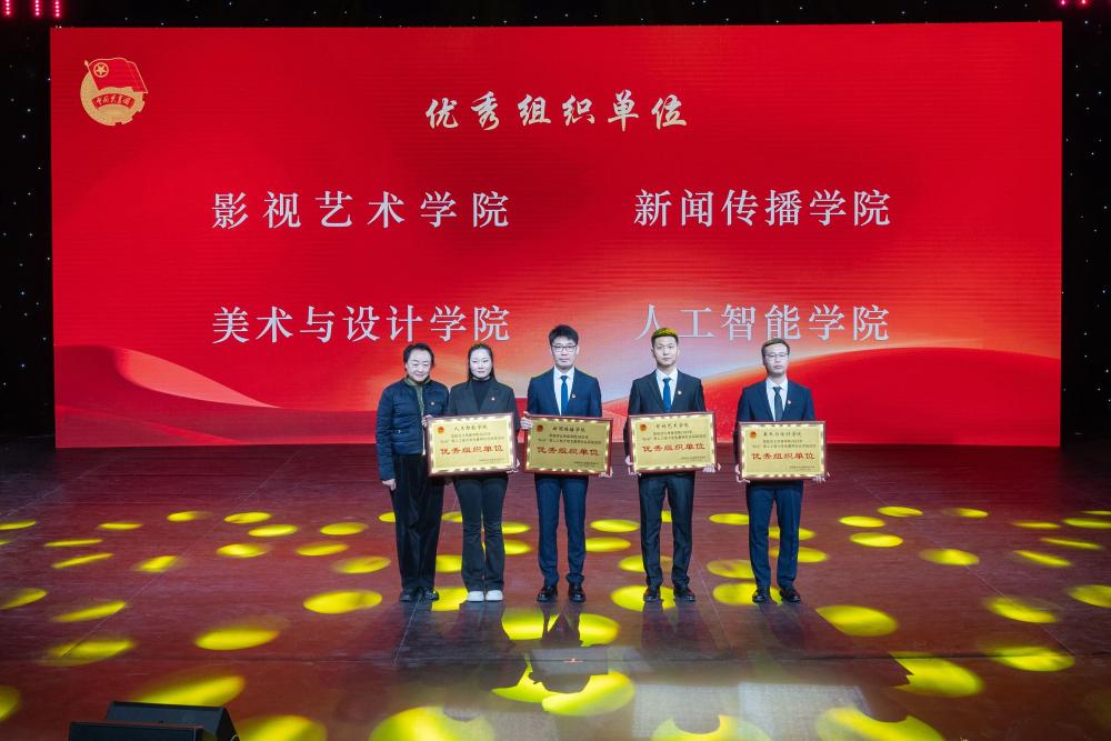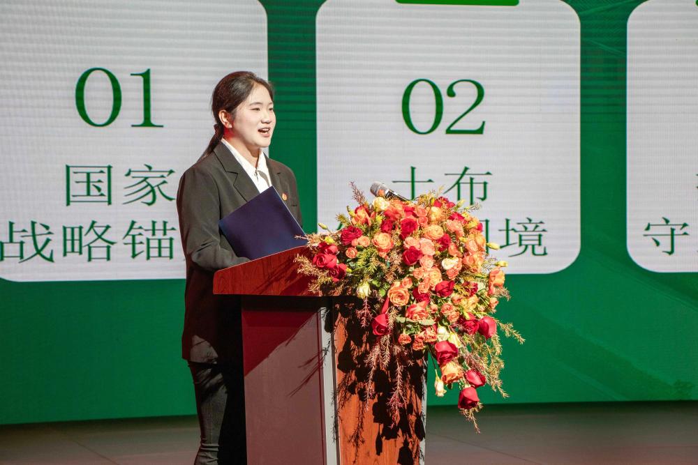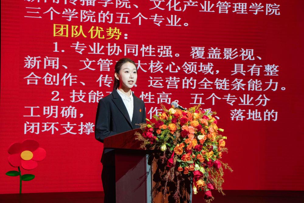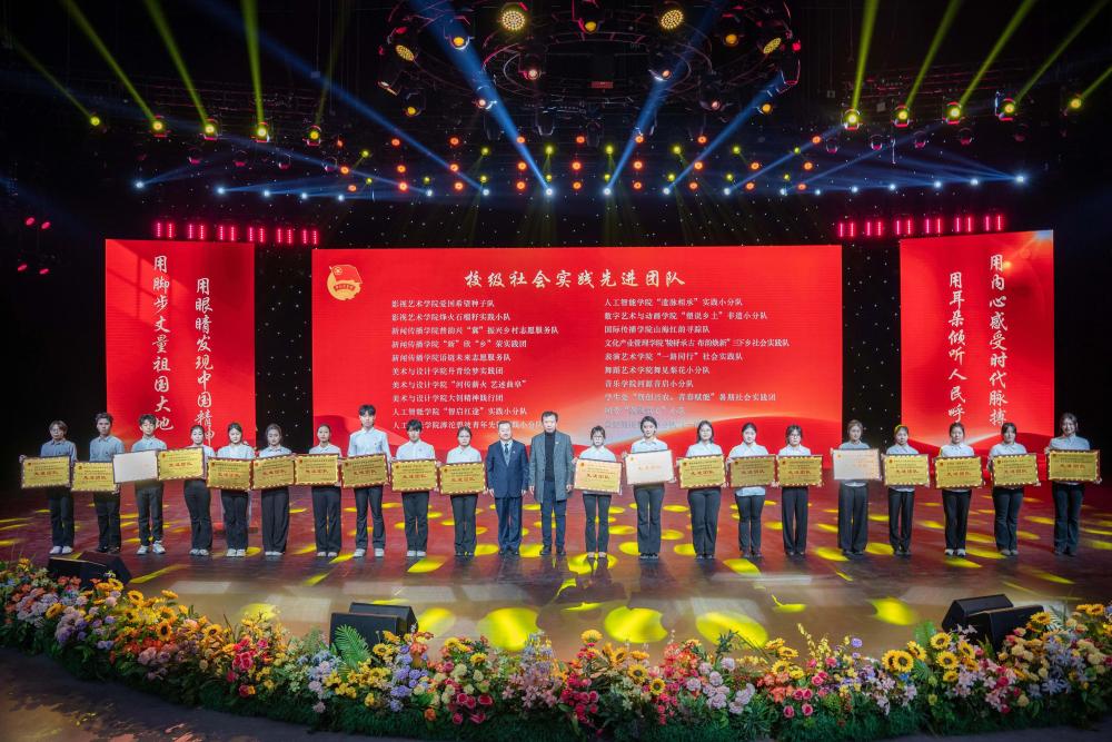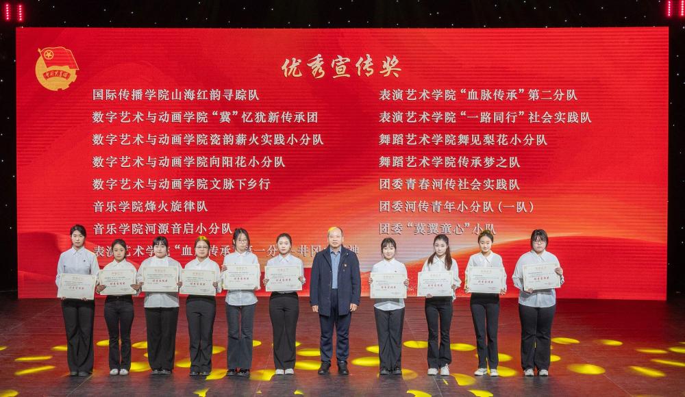 会上,人工智能学院团委书记蔡雨杉、影视艺术学院“爱国希望种子队”皇甫博文同学、文化产业管理学院“梭杼承古 布韵焕新”实践队刘幸婷同学、校团委“冀翼同心实践队”王芮孚同学作为代表进行实践活动感悟分享。新闻传播学院同学们带来的朗诵《以青春之名,赴传媒之约》,深情表达了河传学子扎根基层、奉献社会的青春誓言。