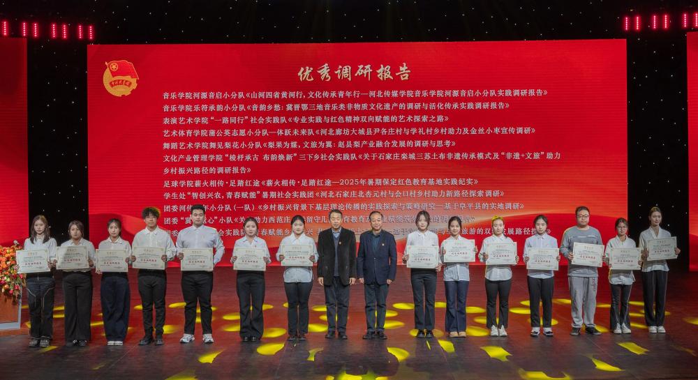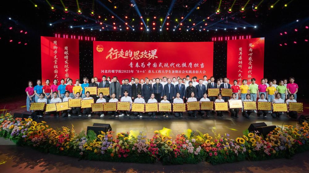 副校长高晓峰宣读了《共青团河北传媒学院委员会关于表彰2025年“8+6”育人工程大学生暑期社会实践活动先进集体和个人的决定》。与会领导为获奖集体和个人颁奖。此次表彰共授予校级先进团队20支、先进个人39人、优秀指导教师32人、优秀宣传奖30个、优秀宣传员40人、优秀调研报告34篇、优秀组织单位4个。