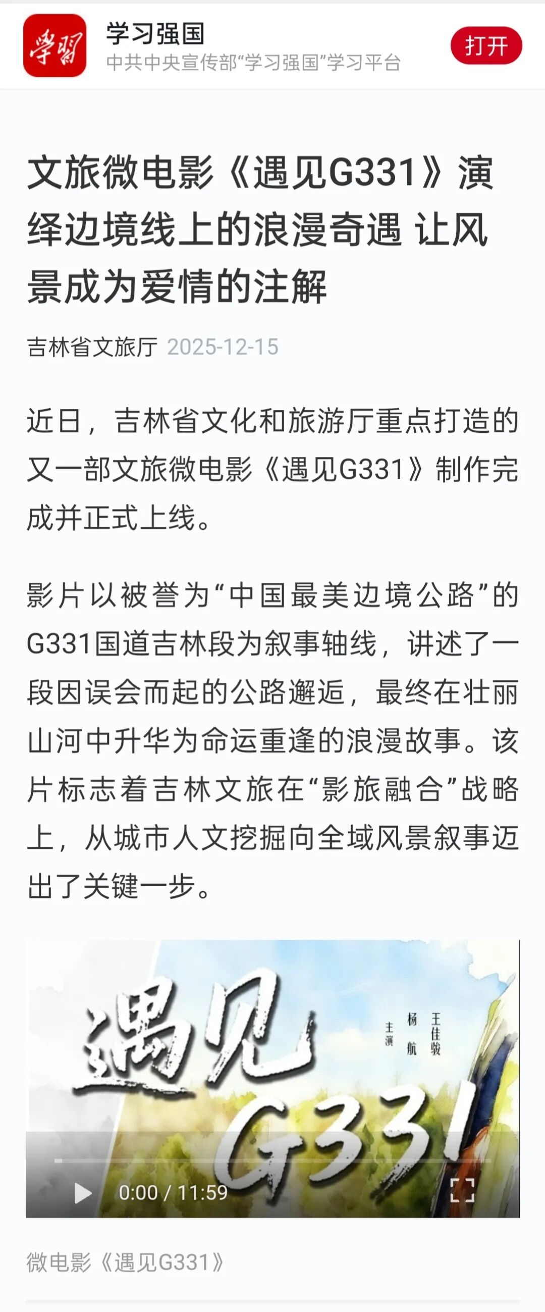 我校毕业生杨航主演的文旅微电影《遇见G331》登陆“学习强国”