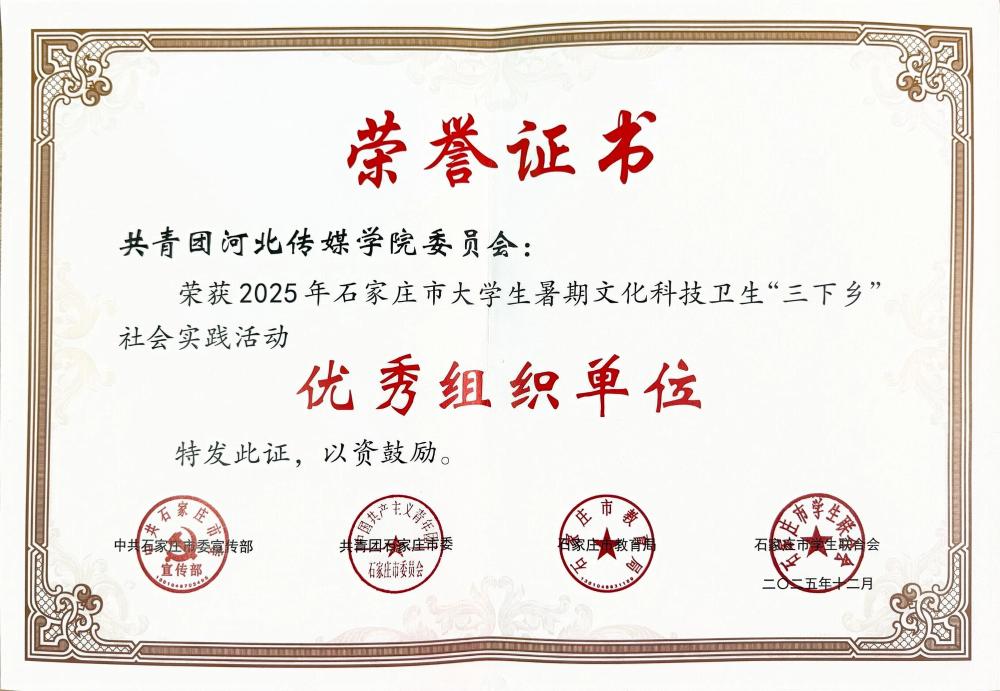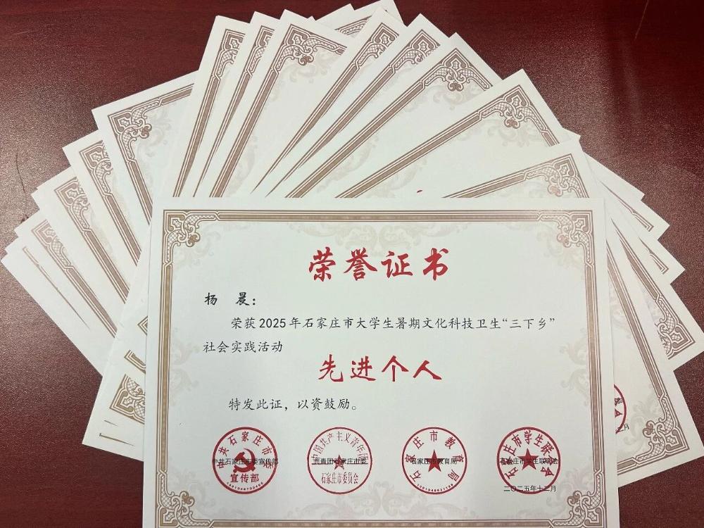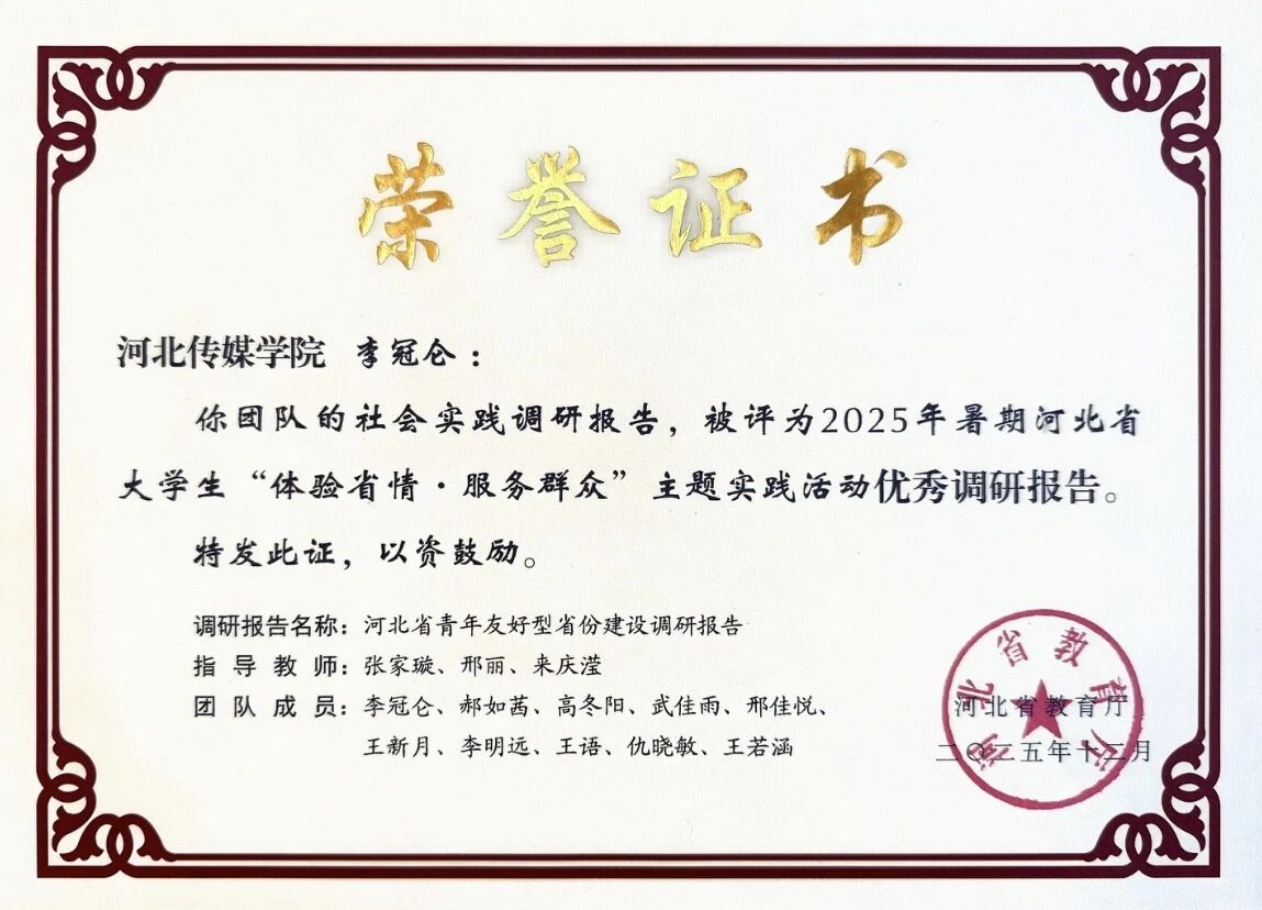 近日,《河北省教育厅关于公布2025年暑期河北省大学生“体验省情·服务群众”主题实践活动结果的通知》发布,全省共评选出优秀调研报告100篇,我校《河北省青年友好型省份建设调研报告》获评“优秀调研报告”。此外,我校被中共石家庄市委宣传部、共青团石家庄市委、石家庄市教育局、石家庄市学生联合会等部门授予“2025年石家庄市大学生暑期文化科技卫生‘三下乡’社会实践活动优秀组织单位”荣誉称号,20支实践团队获评“先进团队”、29名教师获评“优秀指导教师”,20名学生荣获“先进个人”,《关于“三下乡”助力弘扬长城文化活动的调研报告》获评“优秀调研报告”。