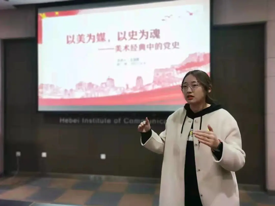 “以美为媒,以史为魂——美术经典中的党史特色主题党日系列学习教育活动”,主要从党员讲、青年说、教师评三个方面具体展开实施。2021年11月至今,美术与设计学院学生党支部将“以美为媒,以史为魂——美术经典中的党史特色主题党日系列学习教育活动”融入学生党员日常培养过程中,每周选择一幅红色主题的经典美术作品,包含油画、国画、版画、雕塑等类别,邀请学院党总支书记、学生党支部书记、教师党支部专业老师、学生党员等不同身份的角色作为主讲人和分享者。通过作者简介+作品鉴赏+党史解读+党史小问号四个环节贯穿全过程。